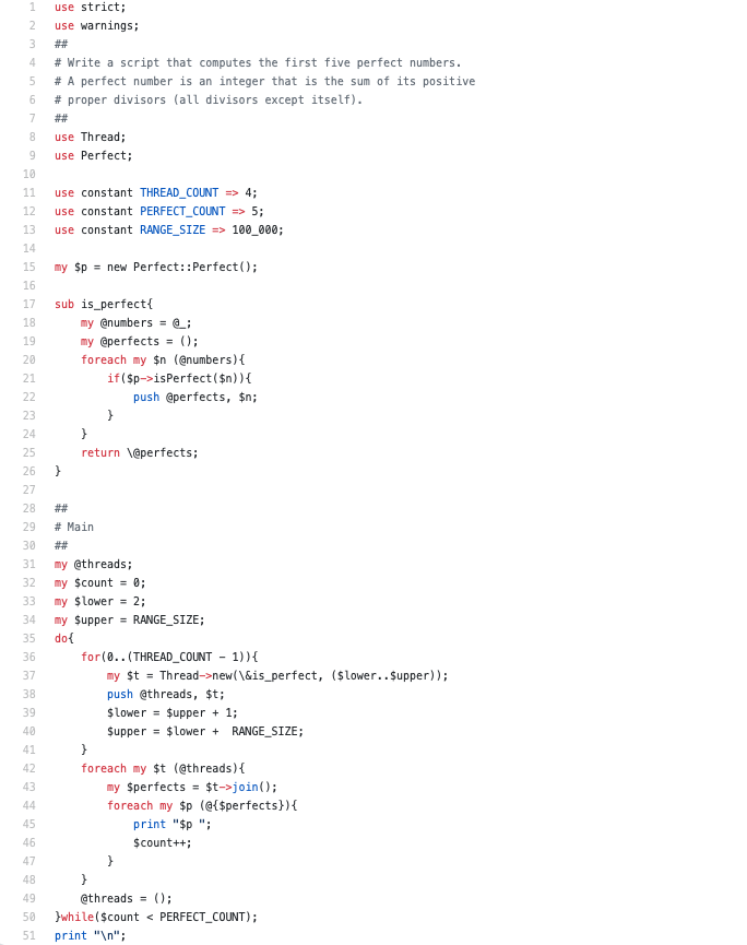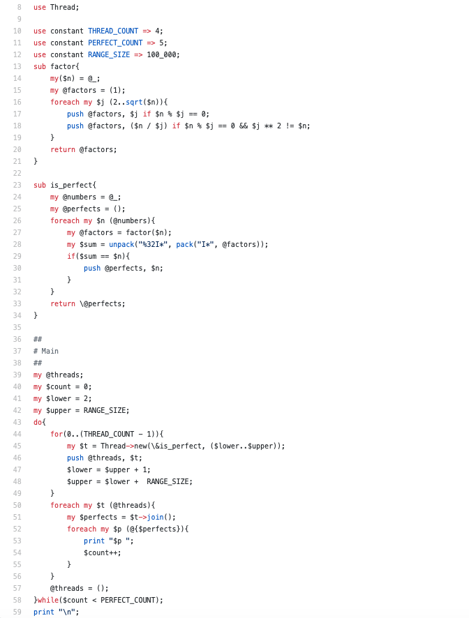 - The RANGE_SIZE is set to a number that I determined experimentally from a few runs to best reduce the number of wasted evaluations but still put the threads to best use. Remember, these are ithreads and so they don't come cheaply. A new interpreter is created for each one. Angry pedants would scold me for not having creating a thread pool and re-used threads. Also, we're going to end up evaluating numbers that we don't need to because a previously created thread will have found the last perfect number while other threads are still running. I'd argue this is a reasonable tradeoff and when looking for larger and larger perfect numbers not that bad, they do occur very sparsely after all. As a reminder: we're only using this perfect number search as a MacGuffin to try out some different methods. If we were really holding ourselves to the mathematics of perfect numbers we'd have computed them directly and have been done with it!
